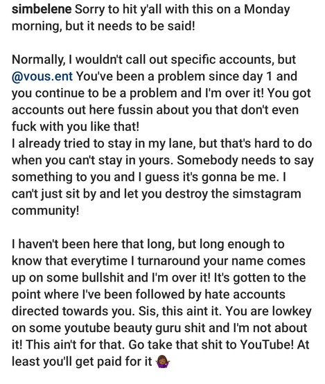 And then she took it to simstagram. She probably would've been fine if she wasn't using SL content and just stayed in her lane. But no, she had to be outta pocket and outta line! You can't say shit like that on the internet sis! Especially on sites like simstagram and tumblr. That will get you cancelled very quickly!